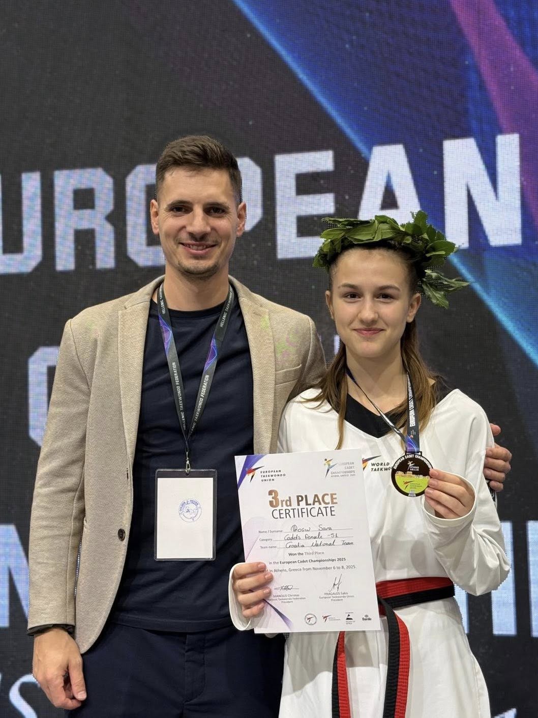 Drugi je dan Europskog kadetskog prvenstva u taekwondou koje se održava u Ateni na kojem sudjeluje više od 500 sportaša. Sara Rogin iz Taekwondo kluba Medvedgrad je s tri pobjede osigurala broncu za Hrvatsku u kategoriji do 51kg. U polufinalu je ipak bila bolja protivnica iz Turske.